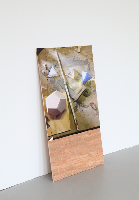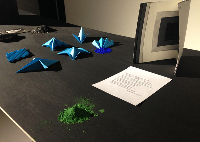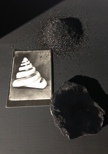 The Fourth Wall, 2017: Photographic print, modified trestle, paper, carbon sand, cadmium green pigment, petrified wood, found text.