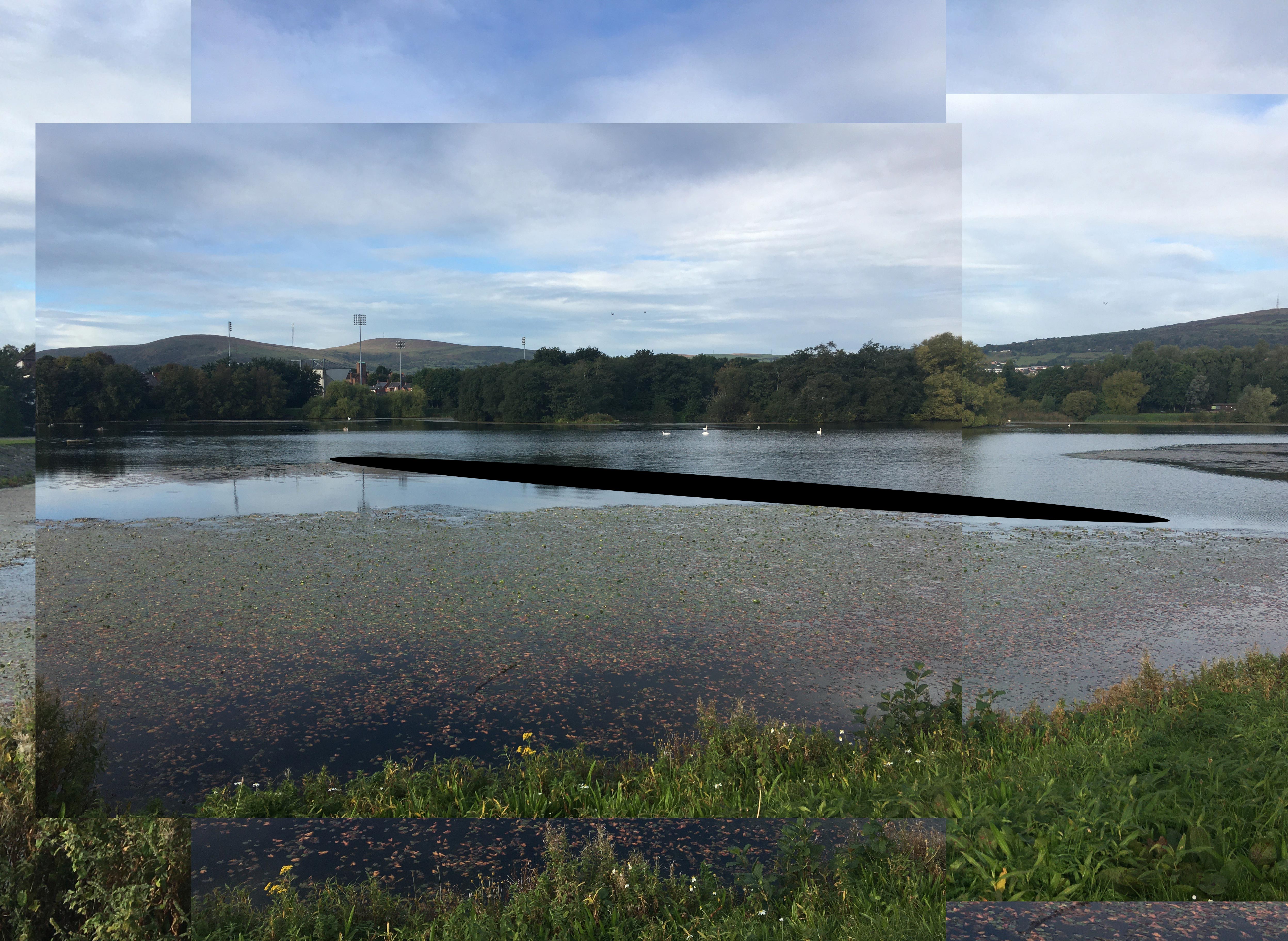 exquisitely carved marble statues falling out of the sky is a temporary floating structure on the top lake at the Waterworks Park in north Belfast. As people walk around the lake, the structure cuts a smooth black ellipse through the surface of the water. At one point on the circuit the viewer can step down to a jetty where, from this view point, the elliptical dimensions foreshorten to form a perfect circle, punching a black hole through the vertical plane of the landscape. Inspired by the environment, it is rooted in principles of classical composition and highlights the pastoral and painterly qualities of the site.