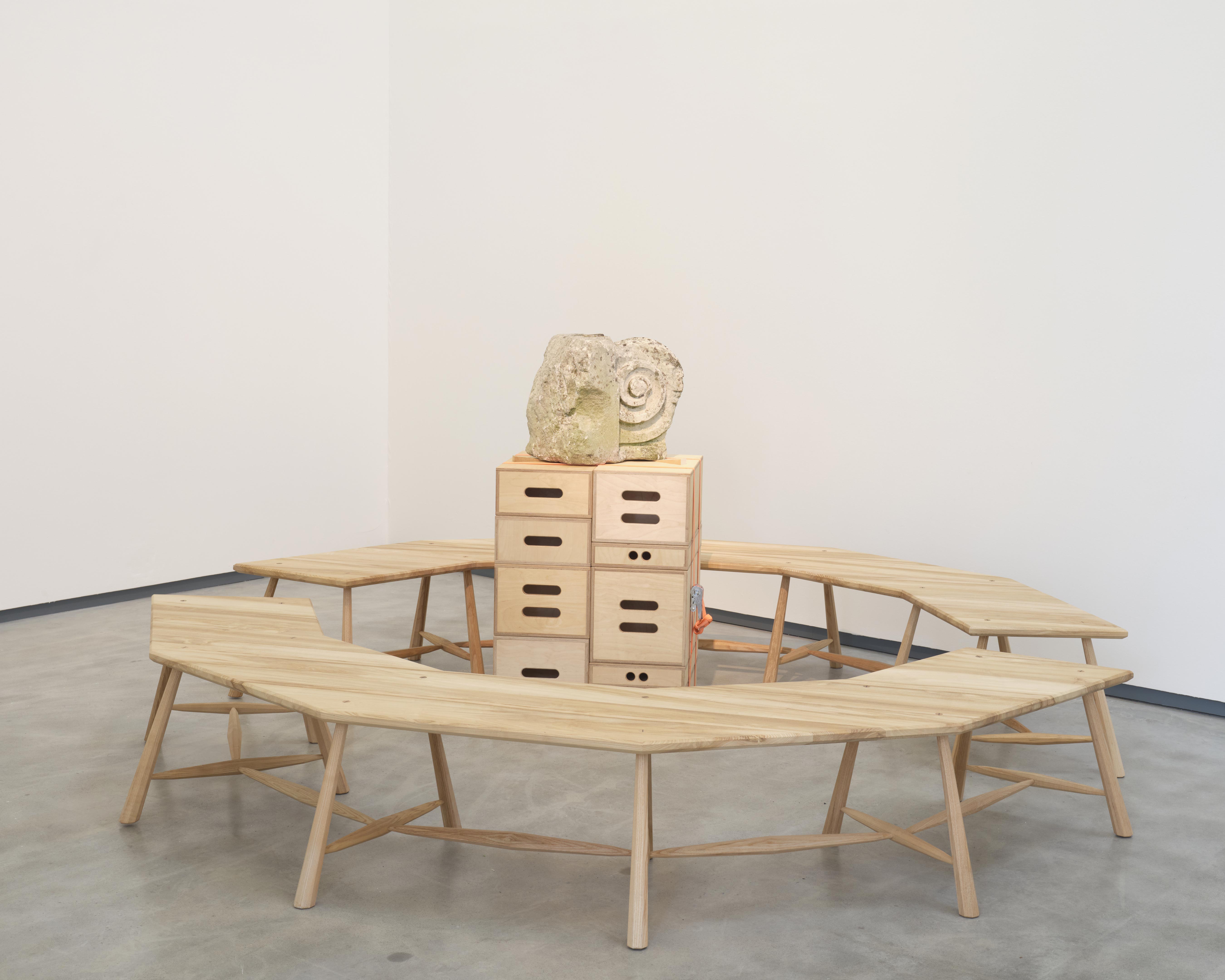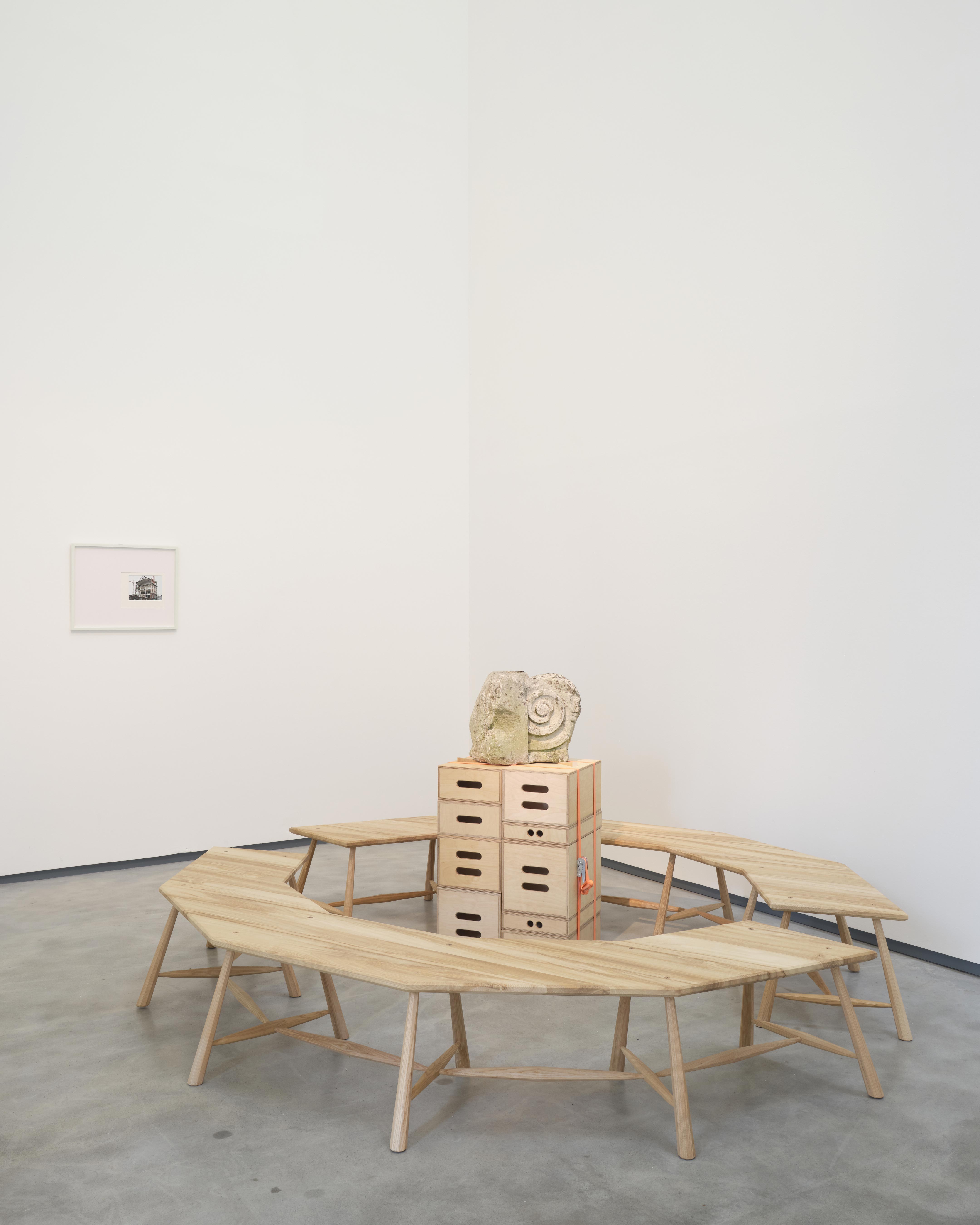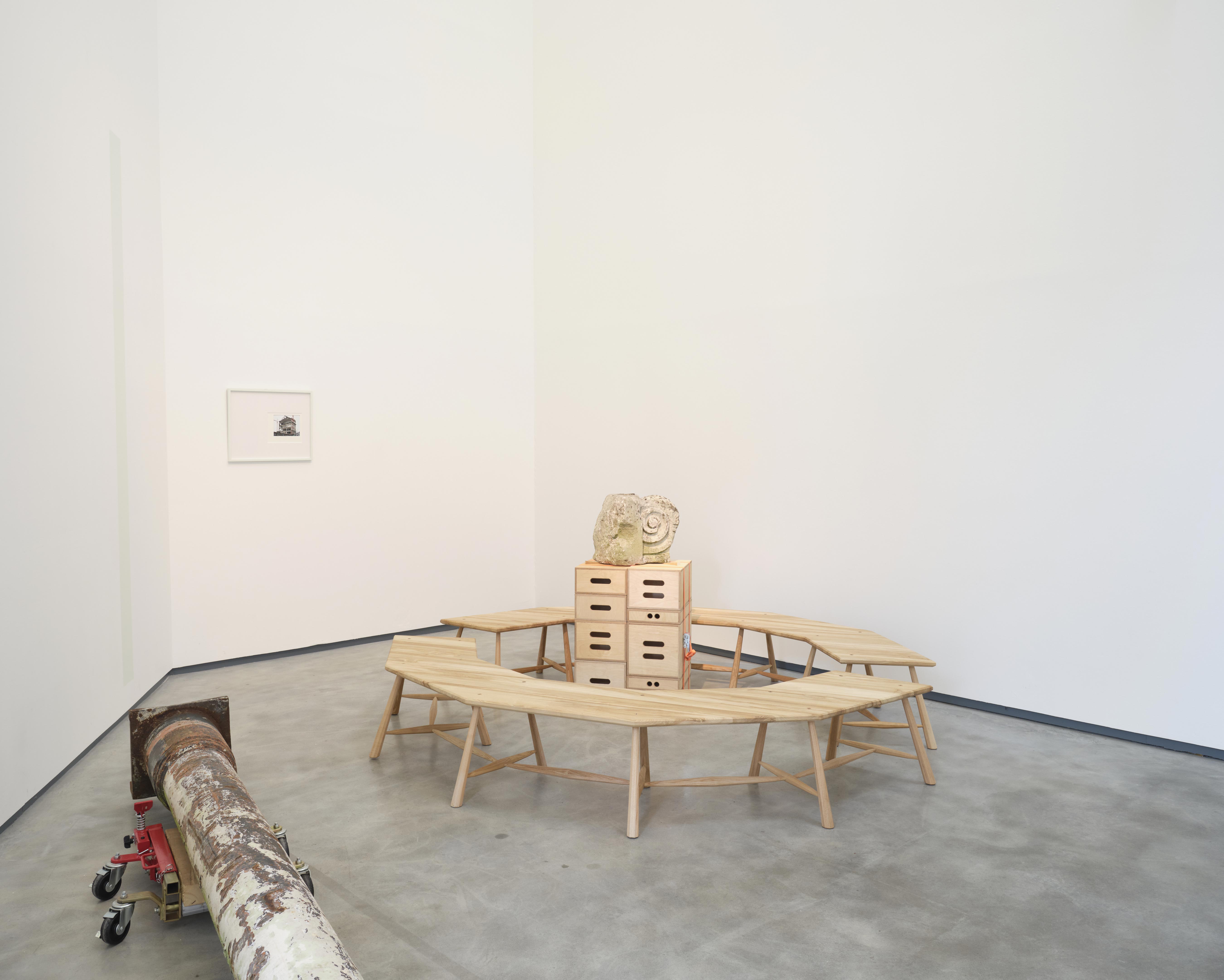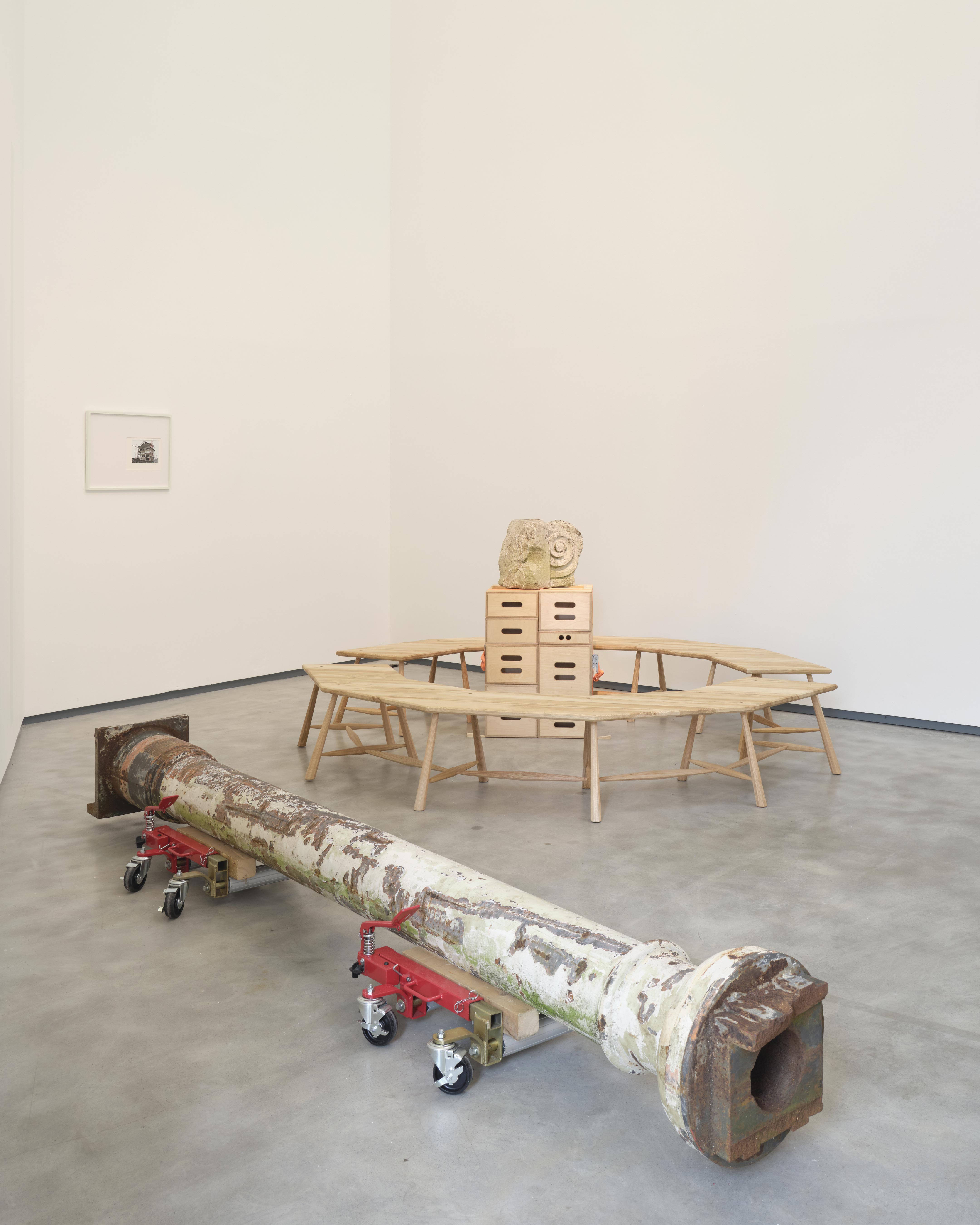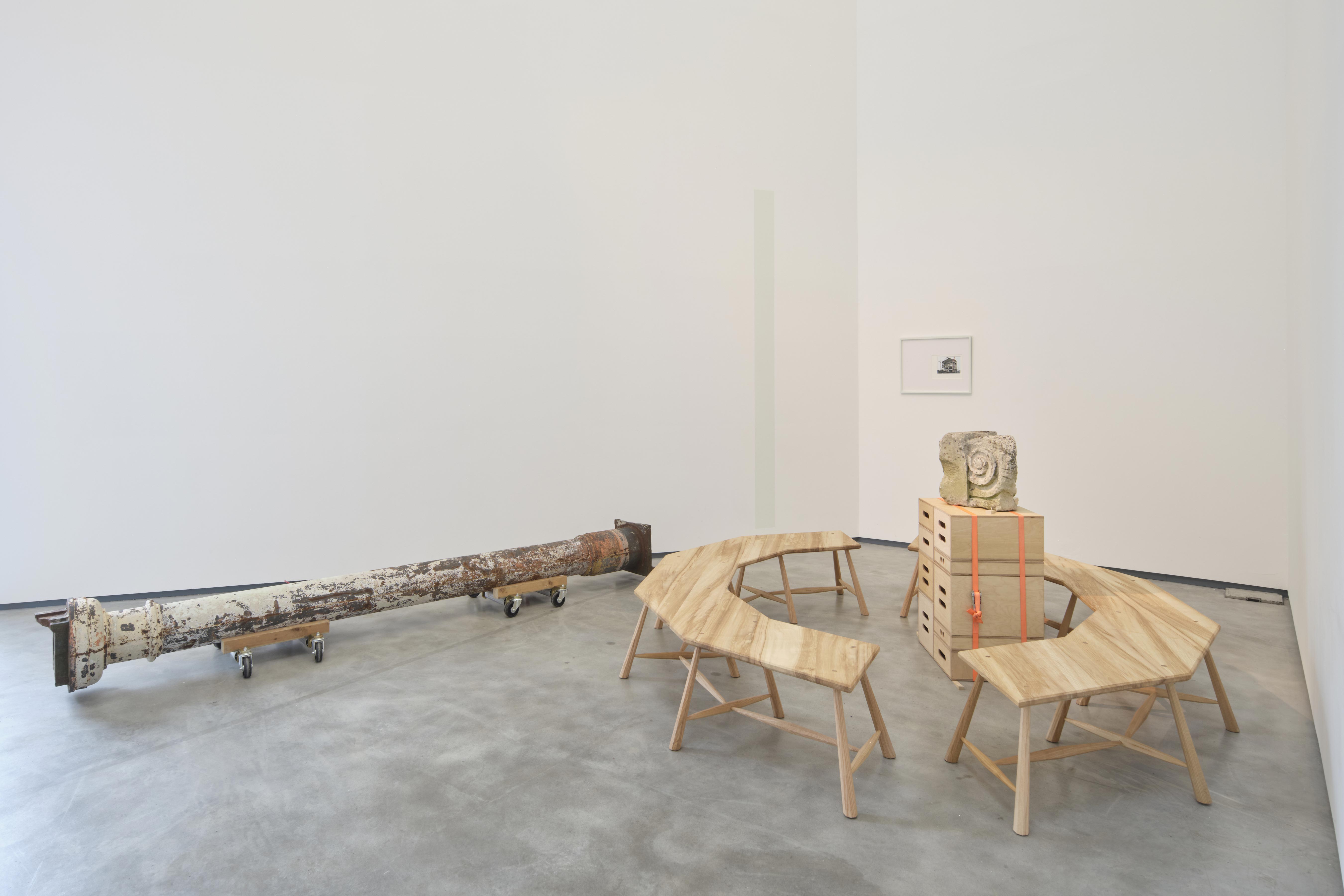 We have returned salvaged pieces from the nearby Orpheus building at Ulster University. Demolished in 2016, the Orpheus was formerly a ballroom, a painting studio, and a formative space that held significance for generations of citizens. Hand-crafted objects and ready-made devices are positioned to illustrate values of generosity and care, and are re-defined through their interaction in the gallery. They push against each other physically and ideologically, in a balancing act of lightness and weight, connection and loss.